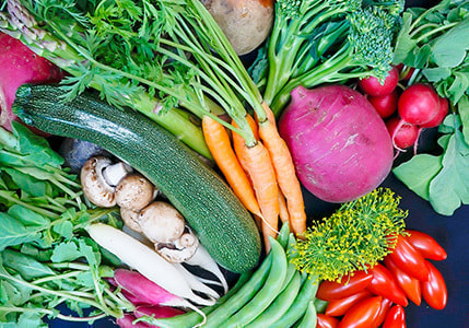 旬の野菜と果物、ハーブやサラダ用のカット済み野菜も取り揃えています。